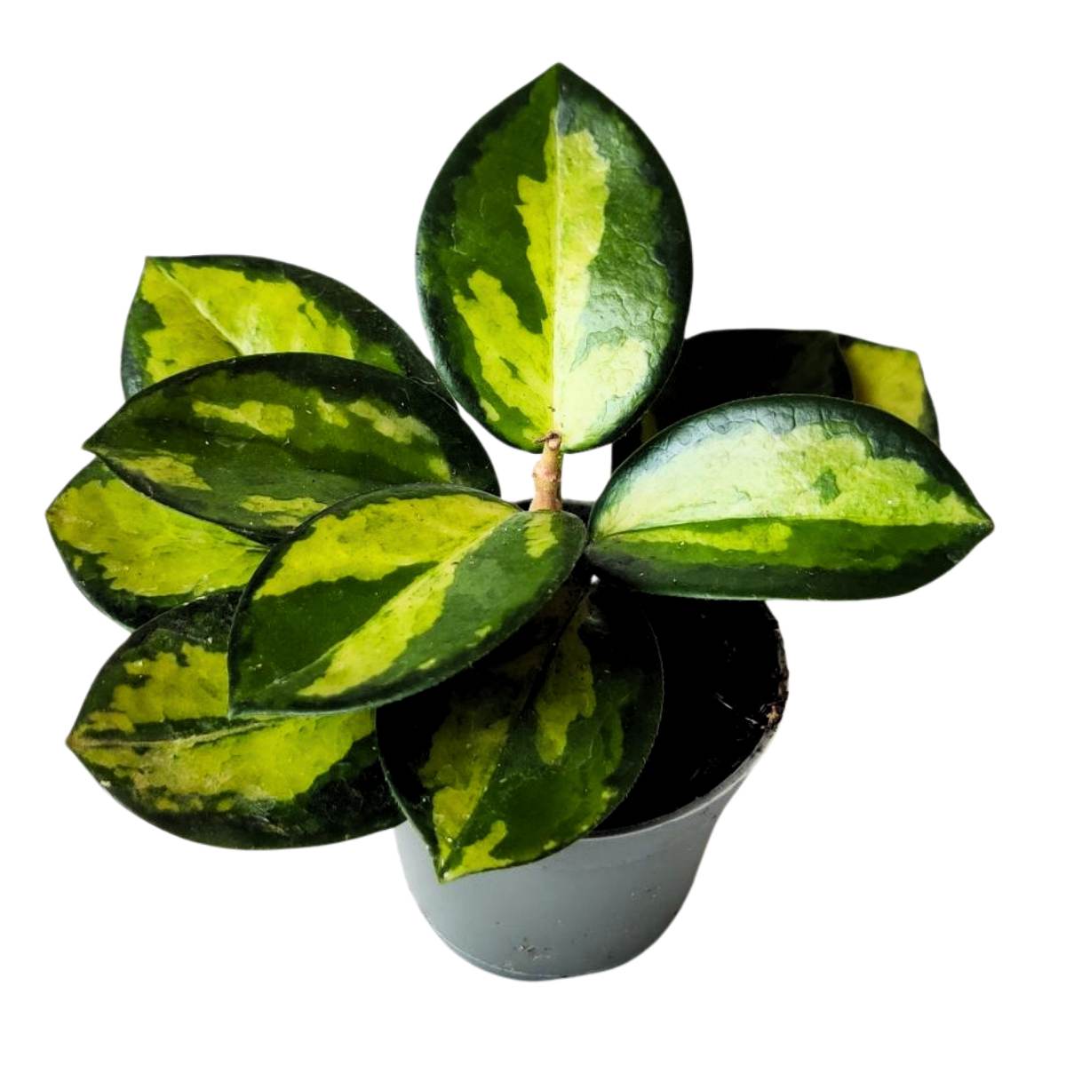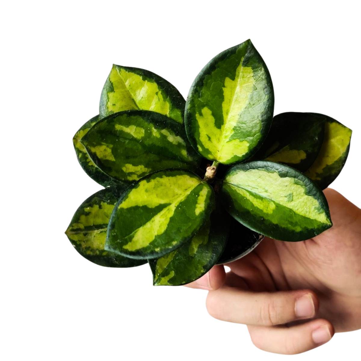 La Hoya carnosa 'Tricolor' es una planta de interior popular y llamativa, conocida por sus hojas cerosas y decorativas que presentan una combinación de colores en tonos verde oscuro, verde claro y blanco cremoso, creando un efecto tricolor distintivo. Originaria de las regiones tropicales del Pacífico, esta especie de Hoya es valorada no solo por su atractivo follaje, sino también por sus flores fragantes en forma de estrella, que suelen florecer en racimos y añaden un toque exótico. Su facilidad de cuidado y su habilidad para prosperar en condiciones de luz indirecta brillante la convierten en una excelente opción para quienes buscan una planta de interior que combine belleza y resistencia