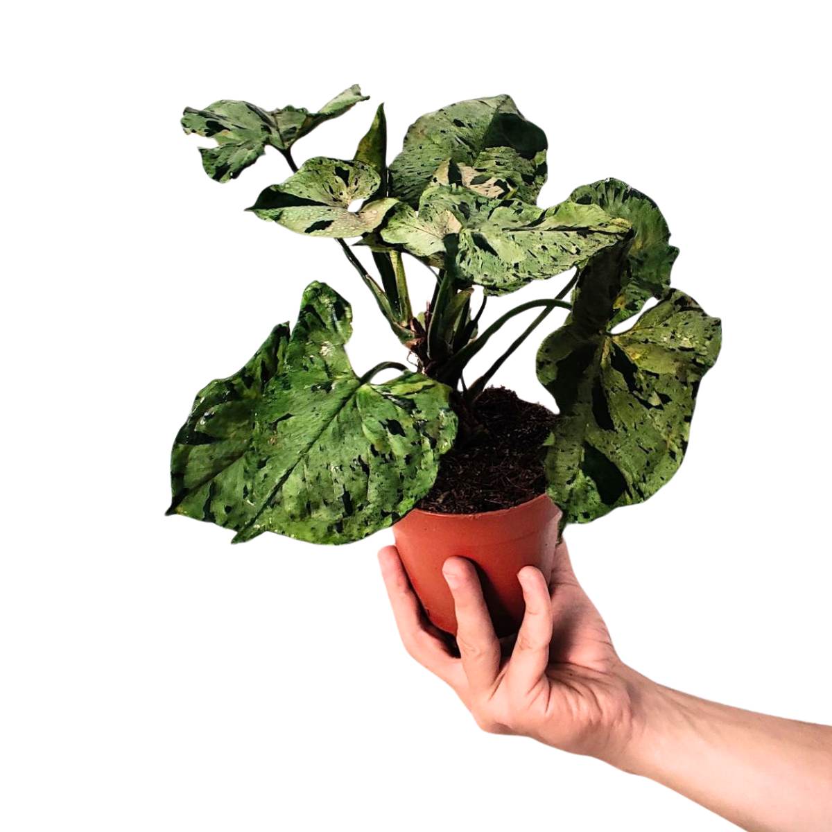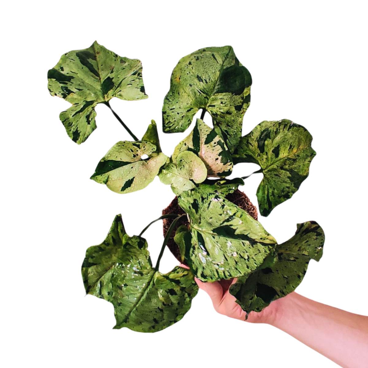 Syngonium 'Green Splash' es una planta de interior popular y visualmente llamativa conocida por sus hojas abigarradas únicas. Pertenece a la familia Araceae y es un cultivar de la especie Syngonium podophyllum. La planta presenta hojas en forma de punta de flecha con una mezcla distintiva de tonos verdes, a menudo salpicadas de manchas de color blanco cremoso o verde claro. Esta variedad le da a la planta su efecto "salpicadura", creando un contraste llamativo que la convierte en una de las favoritas entre los entusiastas de las plantas. Como planta tropical, prospera con luz indirecta y prefiere suelos con buen drenaje, lo que hace que sea relativamente fácil de cuidar en interiores.
